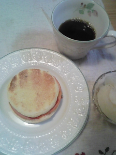 朝食; イングリッシュマフィン 150 コーヒー おやつ; コアラのマーチ 80 コーヒー 昼食: イングリッシュマフィンのサンド 200 コロッケ少し 梨2きれ コーヒー